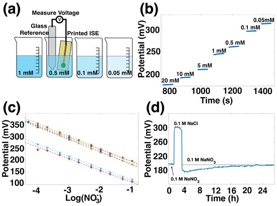 Environmental quality monitoring and precision agriculture require nitrate sensors that are mass-producible, easy-to-read, involve few or no moving parts, and are robust enough to survive field deployment and soil insertion. Printed solid-state potentiometric ion-selective electrodes have the potential to meet these criteria. The use of printing methods for the sensor fabrication offers several advantages, such as low cost, high throughput, and ease of fabrication. Potentiometric sensors are composed of two electrodes: an ion-selective electrode (ISE) and a reference electrode (RE). The signal output is the potential difference between the two electrodes at zero-current conditions, as shown in Figure 1b. An ISE has a polymer membrane doped with an ionophore—a chemical designed to selectively and reversibly bind to the ion of interest [10,11,12,13,14,15,16,17,18]. As the concentration of the ion of interest, in this case, in the sample solution increases, the potential that develops at the boundary between the ion-selective membrane and the sample increases. Buhlmann and Chen provide a clear background explanation of the chemistry and thermodynamics governing this process [19]. The result is that the potential at the ISE is described by the Nernst equation: