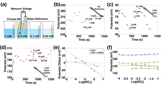 The optimized RE composition was achieved with the addition of NaNO3 to the PVB-NaCl membrane. Cattrall and Zamarayeva et al. [40,41] have shown that including the ion of interest in the membrane of an RE reduces its sensitivity to that ion. To reduce sensitivity to nitrate, NaNO3 was added to the membrane; sensitivity data for this electrode are shown in Figure 3d. This formulation has a sensitivity of −3 mV/dec, which is a marked improvement over the NaCl membrane alone.