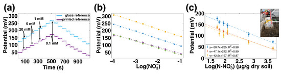 (a) Potential over time for an ISE measured against a commercial glass reference electrode (light blue) and against a printed reference electrode (dark purple). The change in reference electrode changed the of the pair by 87 mV. (b) Sensitivity curves for printed sensors from two different batches. The average sensitivity for these four sensors is 48.0 ± 3.3 mV/dec. (c) Potential versus nitrate concentration for three sensors in a high-organic-matter soil.