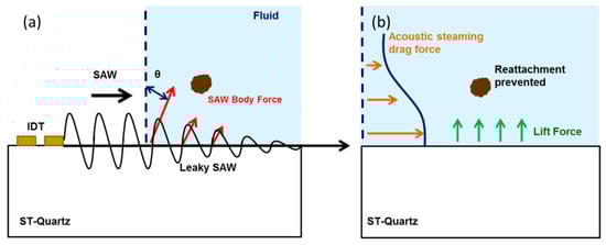 An alternative is to use ST-Quartz because it is more robust mechanically and less expensive. In addition, it supports both Rayleigh waves and a surface skimming bulk wave (SSBW) that has SH particle polarization [36,37,38]. Several investigators over the years have used the SSBW wave mode for biosensing in liquids [39,40,41]. However, the Rayleigh wave in ST Quartz compared to LiNbO3 and Langasite has a weaker surface normal component owing to its weaker electromechanical coupling coefficient. Therefore, a relatively higher power is required for the Rayleigh waves generated on ST-Quartz to generate a force sufficient to overcome NSB.