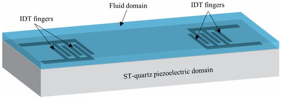 The model consisted of a SAW device based on ST-quartz substrate 400 μm wide × 800 μm long × 200 μm deep in contact with a 50-μm-thick fluid as shown in Figure 2. The input and output interdigital transducers (IDTs) each contained three finger pairs and were coupled by the voltage degree of freedom. The excitation of the piezoelectric solid was provided by applying an AC voltage at two different center frequencies (50 and 100 MHz) on the transmitter IDT fingers. The structure was simulated for a total of 100 nanoseconds (ns) with a time step of 1 ns.