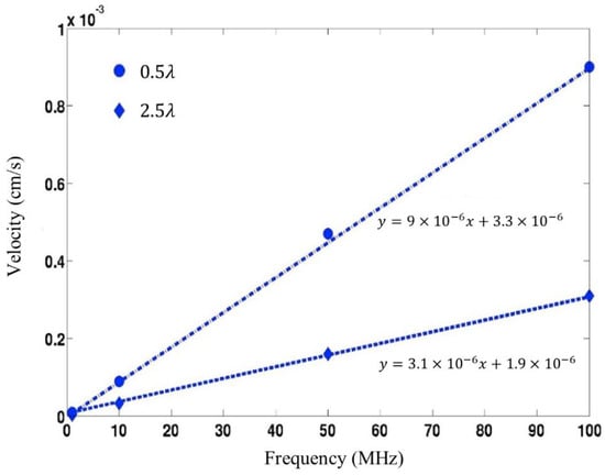 Our simulated results show that the streaming velocity increases with the SAW frequency (Figure 3). The simulated streaming velocities are in the µm/s range for the frequencies studied, which are consistent with experimental values found in the literature for streaming flows induced by SAW devices [28,29,30]. As the frequency of the surface-acoustic-wave device increases, it would lead to an increase in the irrotational velocity. This in turn results in an increase in the acoustic-streaming velocity, which is proportional to the square of the irrotational velocity. Note, however, that the acoustic-streaming velocity is also proportional to the square of the amplitude of SAW displacement. The simulated SAW amplitudes tend to increase with decreasing device frequency. This has also been observed in the experimental studies of Sano et al. [31] and Shiokawa et al. [32]. Therefore, the increase in SAW amplitude somewhat offsets the corresponding decrease in the device frequency. As a result, the simulated SAW streaming velocities shown in Figure 3 exhibit a near-linear variation.