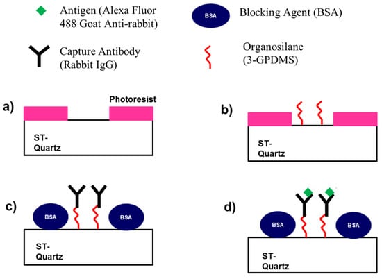 Processing steps to create patterned areas where specific binding occurs. (a) Photoresist is patterned to expose areas on ST-Quartz substrate. (b) Exposed areas are functionalized with organosilane film (3-GPDMS). (c) Capture antibody (rabbit IgG) is covalently immobilized and BSA is applied to block non-sensing areas. (d) Fluorescently tagged antigen (Alexa Fluor 488 goat anti-rabbit IgG) is specifically attached to capture antibody (rabbit IgG).