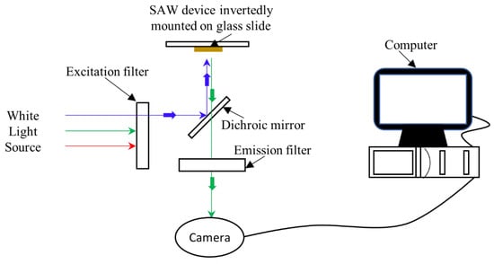 Fluorescence images were taken with a Leica DMI 4000B fluorescence microscope (Leica Microsystems, Wetzlar, Germany). Prior to imaging, the SAW device was inverted and mounted on a glass slide covered with a thin PBS film. A 20X objective lens along with a Leica DFC340-FX monochrome digital camera (Leica Microsystems) were used for all image capturing. The microscope had the following settings: Γ = 1.0, gain = 1.3, and exposure time = 3.6 s. Schematic of the experimental setup is shown in Figure 5. For Alexa Fluor 488 we used the I3 filter cube with an excitation filter with a bandpass of 450–490 nm. Image analysis was completed using ImageJ software. For quantitative analysis, we defined signal as the fluorescent intensity of the sensing regions and background as the fluorescent intensity of the non-sensing regions.