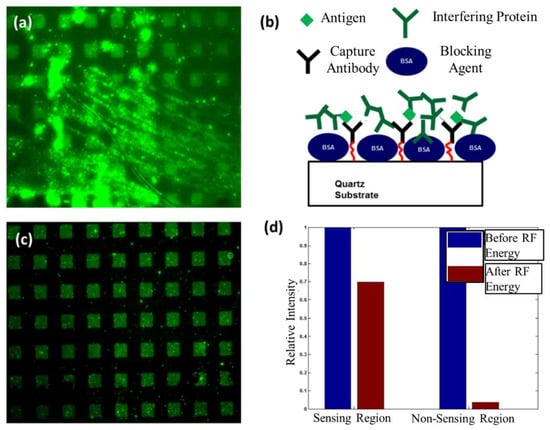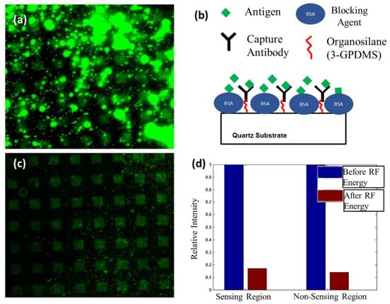 During biosensing, the antigen of interest can weakly bind to other antigens on the surface and to non-sensing areas producing an inflated response. Antigens (Alexa 488 goat anti-rabbit IgG) non-specifically bound to sensing and non-sensing areas were assessed by creating a micropattern, containing the capture antibody (rabbit IgG) in defined areas. To compare the amount of non-specific interaction, two images were taken. First, a fluorescent image was taken after application of the antigen and performing a standard rinsing step with PBS (Figure 6a). Then, PBS (10 μL) was placed on to the delay path and RF power was applied to the input of the SAW device for 10 min. After rinsing we obtained a second image of the SAW delay path (Figure 6c). Figure 6a shows that the square pattern we tried to obtain is occluded by a fluorescent signal of higher intensity occurring randomly over the entire surface which is due the agglomeration of antigen molecules. In Figure 6c, taken after the application of acoustic energy, the fluorescent signal in random locations shown in Figure 6a was reduced significantly and the desired square pattern is clearly visible. The results suggest that antigens bind to other antigen molecules, which is evident by the high intensity signal caused by their agglomeration (Figure 6a). In addition, antigens will also bind to sensing and non-sensing regions indiscriminately seen by the randomness of the fluorescent signal shown in Figure 6a. After comparing the results in Figure 6a,c, we conclude that the antigen-binding is relatively weak and can be characterized as non-specific. Furthermore, the results show that acoustic energy has the ability to remove weakly bound antigens where rinsing alone has failed. Not only has non-specifically bound material been removed, but antigens covalently immobilized to the patterned region stay intact (Figure 6c). Thus, removal can be accomplished without disrupting specific binding between an antigen and its capture antibody. To quantitatively determine the amount of antigen removed in both sensing and non-sensing regions, we averaged the fluorescent intensity for both areas before and after application of acoustic energy. The intensity values were normalized to values obtained before excitation of SAWs. Results given in Figure 6d show that the fluorescent intensity decreased by 83% in the sensing areas and 86% in non-sensing areas.