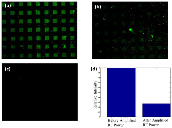 Results after applying an amplified RF signal to the SAW input. (a) Image of fluorescent intensity shows Alexa 488 tagged antigen (goat anti-rabbit IgG) bound to sensing regions after non-specifically bound proteins were removed with SAWs as outlined in Section 5.2. (b) Image of fluorescent intensity at the middle of the delay path after applying an amplified RF signal. (c) Image of fluorescent intensity near the input IDT after applying an amplified RF signal. (d) Plot of relative fluorescent intensity for sensing regions with respect to values obtained before application of an amplified RF signal.