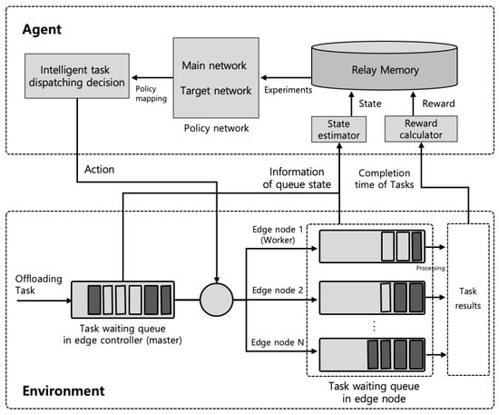 where is the queuing delay in the task waiting queue of the edge controller, and is the queuing delay in the task waiting queue of nth edge node. is dependent on the decision processing time that occurs while selecting the edge node for task dispatching by the agent. Accordingly, , after arriving at the task waiting queue of the edge controller, can be calculated and defined by