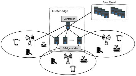 We evaluate the performance of the proposed DDM model in the network model shown in Figure 4, which consists of 100-static nodes, one cluster edge computing system, three BS, and a cloud.