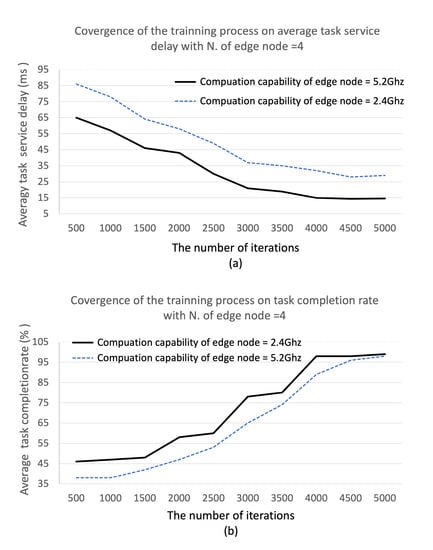 The convergence performance of the proposed DDM model on: (a) average task service delay; (b) task completion rate with the number of edge node = 4.