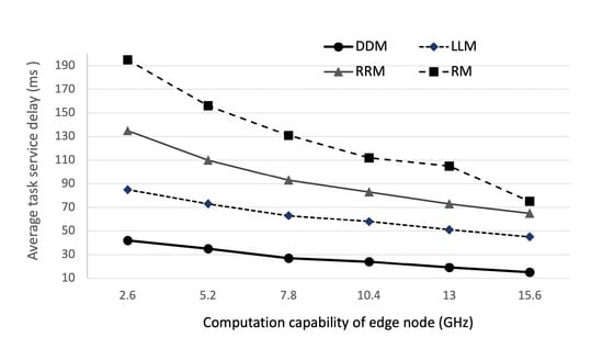 We first examine the convergence performance of the proposed DDM model with the number of iterations. As shown in Figure 5a, the average task service delay decreases in the 4000 iterations and enters a stable status and also, as shown in Figure 5b, in the 4000 iterations, average task completion rate converges to as the training proceeds, showing that the algorithm in the proposed DDM model will reach convergence. Then, we evaluate the impact of the computation ability of edge nodes and the number of edge nodes in the cluster edge on the average task service delay. As shown in Figure 6 and Figure 7, we set the computation capacity from 2.6 GHz to 15.6 GHz and the number of edge nodes from 2 to 12. The proposed DDM model compares the performance with the Random Method (RM), the Least Load Method (LLM), and the Round-Robin Method (RRM). As expected, the simulation results show that average task service delay decreases according to the increase in the computational ability and the number of edge nodes. Furthermore, regarding computational ability, the proposed DDM model improves the performance compared to the total average value of average task service delay by 55%, 70%, and 78% compared with RM, LLM, and RRM, respectively. Regarding the number of average edge nodes, the proposed DDM model improves the performance compared to the total average value of average task service delay by 43%, 61%, and 66% compared with RM, LLM, and RRM, respectively. Specifically, we see that the average task service delay of the proposed DDM model decreases from 35 ms to 13 ms when the number of edge nodes increases from 2 to 12. These results are because the proposed DDM model performs the load-balancing of the offloaded tasks well. We also observe that the offloading task ratio increases as the computational utility of edge nodes in the cluster edge increases. This shows that the DDM model can offload more tasks to the cluster edge.
