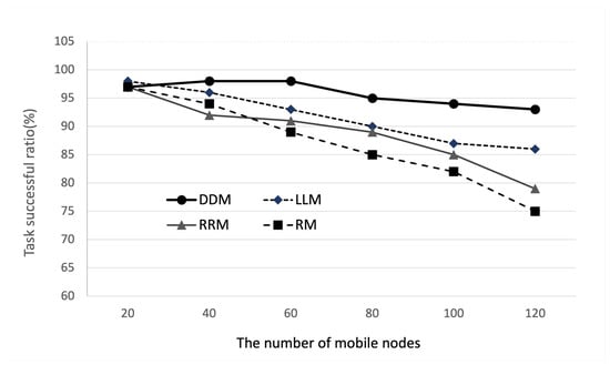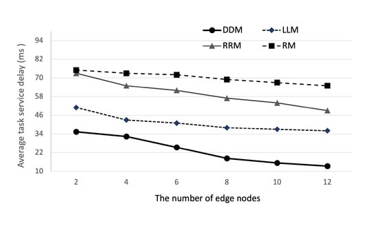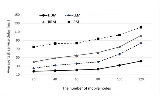 Figure 9 and Figure 10 show the impact of the number of mobile nodes on the average service latency and task successful ratio. As shown in the simulation results in Figure 9, the average task service delay of the DDM model increases from 18 ms to 42 ms when the number of mobile devices increases from 20 to 120. Additionally, compared with RM, LLM, and RRM, we can observe that the proposed DDM model improves the performance compared to the total average value of average task service delay by 43%, 59%, and 72%, respectively. This result is because the proposed DDM model distributes the offloaded task well in a dynamic environment. In addition, as shown in the simulation results in Figure 10, we can observe that the task successful ratio according to the number of mobile nodes decreases from 97% to 93%. Compared with RM, LLM, and RRM, the proposed DDM model improves the performance on the total average value by 4%, 6%, and 7%, respectively. This is mean that the proposed DDM model has a better performance than existing traditional methods and is an intelligent task dispatching policy, which can adjust well in dynamic edge service environments. As part of future works, we plan to extend our DDM model and then evaluate the extended model with a cluster emulator as the Fogify [26] in a real environment.