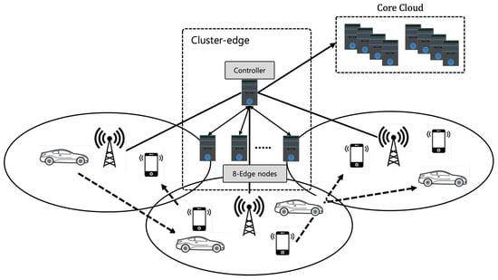 Next, we evaluate the performance of the cluster edge in mobile environments, as shown in Figure 8, which consists of mobile nodes, one cluster edge computing system with eight edge nodes, three BS, and a cloud. We assume that the network supports the data handover between two BSs and only considers the change in channel quality during the mobile nodes’ handover. In this simulation, the number of edge nodes is eight and the computational ability is 10.4 GHz.