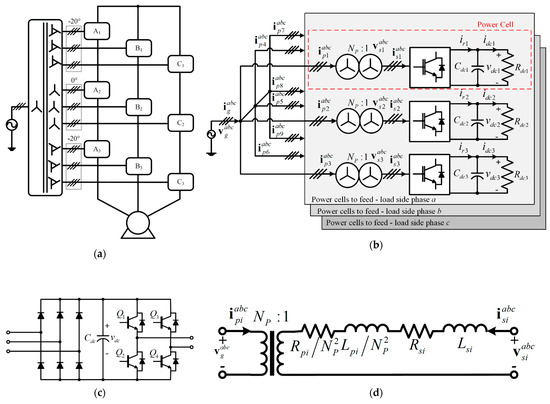 (a) AC drive based on CHB, (b) traditional power cell for AC drive based on CHB, (c) proposed topology, (d) wye–wye input transformer model referred to the secondary winding.