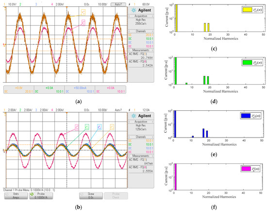 Key waveforms input current control: (a) input voltage (yellow) and current (magenta) vpa and iga, (b) input current phase a is1a (yellow), is2a (green), is3a (blue) and iga (magenta), (c) harmonic spectrum is1a, (d) harmonic spectrum is2a, (e) harmonic spectrum is3a, (f) harmonic spectrum iga.