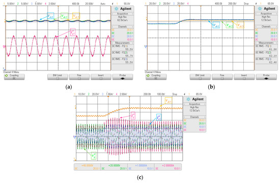 The dynamic behavior of the controller is shown in Figure 7b. The system was subjected to a step-change of 18% (10 V), which goes from 55 V to 65 V. The DC voltages respond to the change imposed by the DC voltage references, where it is seen that the overshoot is less than 5% and the settling time is 300 ms. For this test, the parameters of the PI linear controller are kc = 0.13 and Ti = 0.07.