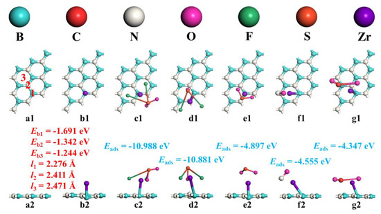 In order to reasonably explore the adsorption of SO2F2, SOF2, SO2, NO, and CO2 gas molecules on the Zr-BN monolayer, the gas molecules were placed near the Zr-BN monolayer in different orientations and positions. The most stable adsorption configuration was obtained by optimizing the adsorption structure, as shown in Figure 1(c1–g2). At the same time, the charge transfer (ΔQ), the shortest distance between gas and substrate (dsub/gas), and the adsorption energy were calculated. The adsorption energy of this study was calculated as follows: