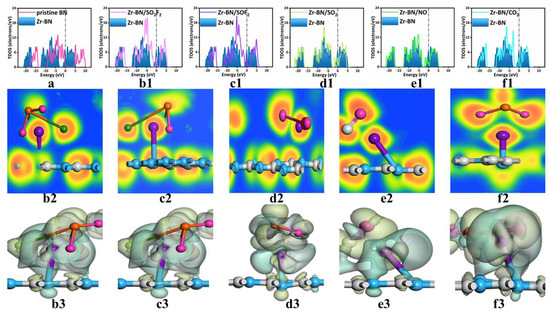 (a) The TDOS of h−BN monolayer and Zr−BN monolayer. The TDOS, ELF, and CDD of (b1–b3) SO2F2 adsorption system, (c1–c3) SOF2 adsorption system, (d1–d3) SO2 adsorption system, (e1–e3) NO adsorption system, (f1–f3) CO2 adsorption system. The Fermi energy was set at zero.