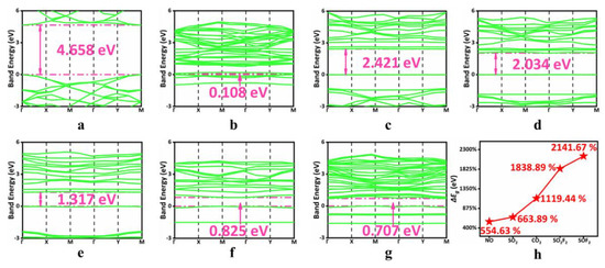 In order to further explore the adsorption mechanism, the band structures of h-BN, Zr-BN, and adsorption systems were calculated, as shown in Figure 3. The results show that compared with h-BN, the band gap energy of the Zr-BN monolayer formed by one Zr atom doping above the B atom of the h-BN monolayer was significantly reduced, and the electron transition was easier. After the adsorption of each gas, the band gap energy increased significantly. This means that after the adsorption of gas, the conductivity of the adsorption system decreases, the resistance increases, and either the reaction’s voltage or current macroscopically increases or decreases, respectively. As shown in Figure 3h, the band gap energy change rate changed by 554.63~2141.67%. This is obvious enough to distinguish between the types of adsorbed gases.
