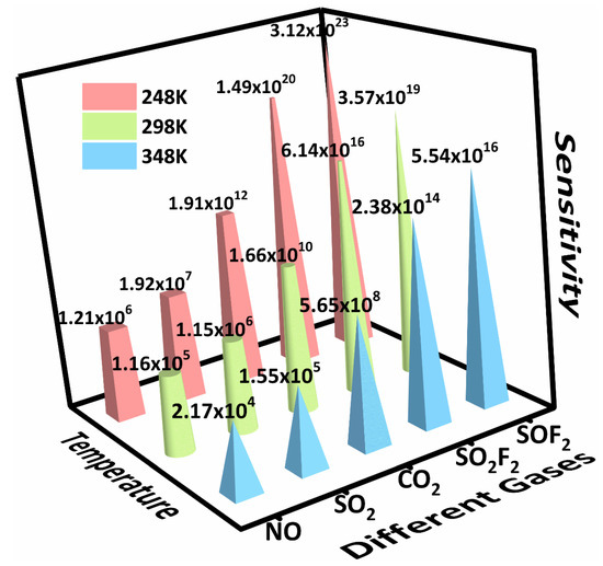 As shown in Figure 4, each adsorption system showed very high sensitivity at different temperatures; the sensitivity was in the order of SOF2 > SO2F2 > CO2 > SO2 > NO. At room temperature (298 K), the sensitivity of SOF2 can reach 3.57 × 1019. This fully demonstrates that Zr-BN has great potential to become a gas sensor for monitoring the above-mentioned polluted gases.
