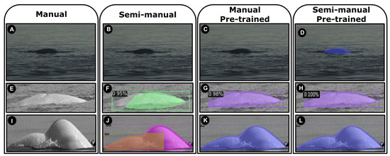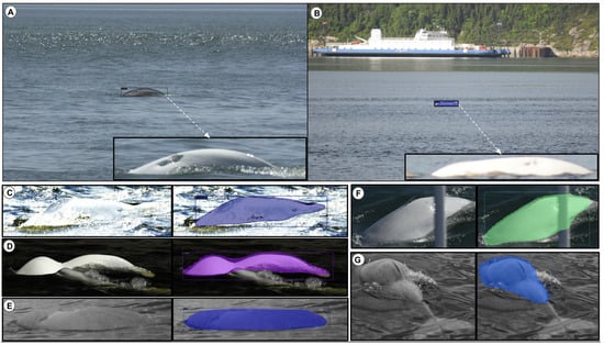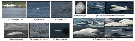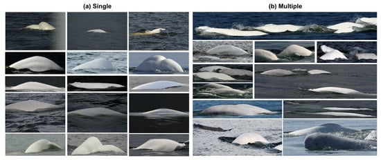 - Partially visible. Mostly, a beluga’s body can be observed only partially (see Figure 1d);