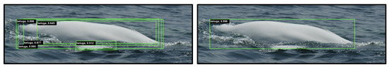 - Multiple objects. Belugas swim in groups and stay close to each other on the scene, making detection difficult when more than one beluga appears overlapped or occluded (see Figure 1i);