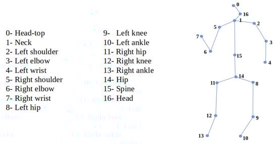 Human pose estimation (HPE) is a popular task in computer vision. It aims to predict and track the location of joints (e.g., elbow, wrist) or body parts of one or more human bodies; it associates them with segments in graphical form (from an image or sequence of images) to represent the human’s orientation and it describe the actual posture. This is an important process for understanding human behavior and human–computer interactions. An example of a human posture skeleton is illustrated in Figure 1.