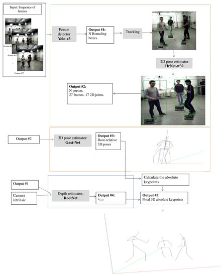The first part of this section presents the basic architectures used in our framework, consisting of four phases: the human detector using Yolo-v3 architecture [], the 2D human pose estimator employing HrNet network [], the 3D root-relative pose estimator using the GAST-Net model [], and the depth root estimator with the RootNet model []. The second part describes the overall pipeline of the framework. The last part details the series of enhancements of our framework on the 3D absolute pose estimator and their impacts on the final result.