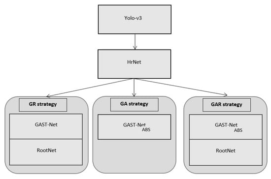 The cropped image of the bounding box was transformed to 384 × 288 to be used as input for the 2D pose estimator. The transformation applied was an affine transformation that preserves collinearity, parallelism, and the ratio of distances between the points, as in []. A unique ID was assigned to each person using the tracking method [] based on the Hungarian optimization algorithm. Then, we used the small architecture of HrNet (HRNet-w32) pre-trained on the COCO dataset [], implemented in PyTorch. The output was 17 heatmaps (resolution: 96 × 72). Cropping was resized to 256 × 256 to be processed by RootNet for depth root prediction . A unique ID was affected for each person using the tracking method based on the Hungarian optimization algorithm. The 27 consecutive 2D coordinates were collected for each person, to be given to GAST-NET.