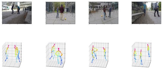 The results of our system with the three improvements are listed in Table 1, which can be compared to the literature results. We evaluated using the MuPoTS-3D dataset since it has been used to analyze 3D multi-person poses in both person-centric and camera-centric coordinates. Following [,], the performance of person-centric 3D pose estimation was evaluated using AUC and PCK metrics, while camera-centric 3D pose estimation was evaluated using AP and PCK metrics. The detailed PCK results per sequence are shown in Table 2. We observed an improvement in the estimation accuracy in most of the sequences.