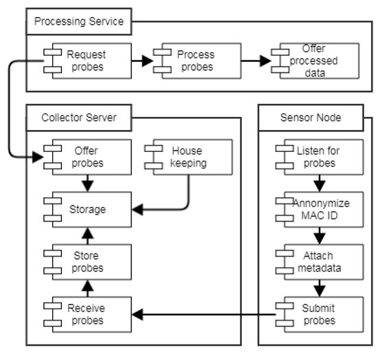 Figure 1 presents the architecture of the system for collecting WLAN probes from WLAN-enabled devices on buses. WLAN probes were collected passively, meaning no connection was established between the sensor and the devices emitting the probes. This was possible because the probes were broadcast by the devices as a first step in querying if the known access points were near, and if so, to connect with them. The broadcast scheme does however also mean that the sensor might not capture all probes due to collisions with probes from other devices. Furthermore, due to the device emitting the probes deciding the frequency with which to emit the probes, there is no certainty that probes from all devices will be captured within a given time interval.