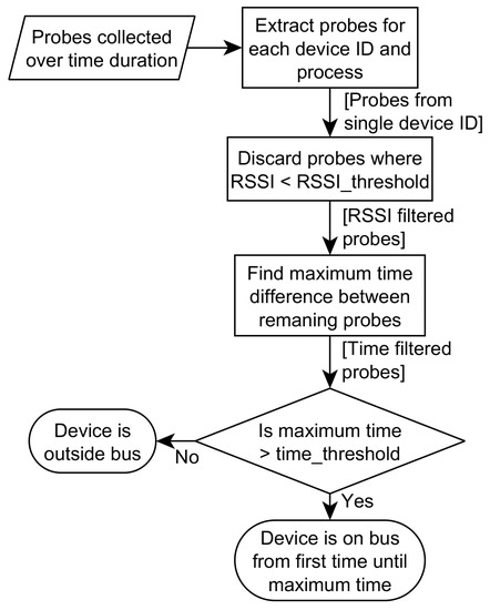 In Figure 2, the flow of the WLAN estimator algorithm is illustrated. Based on a set of probes collected over a time interval, the algorithm applies the two threshold filtering steps on a subset of probes per device ID and decides if that device is inside or outside the bus.