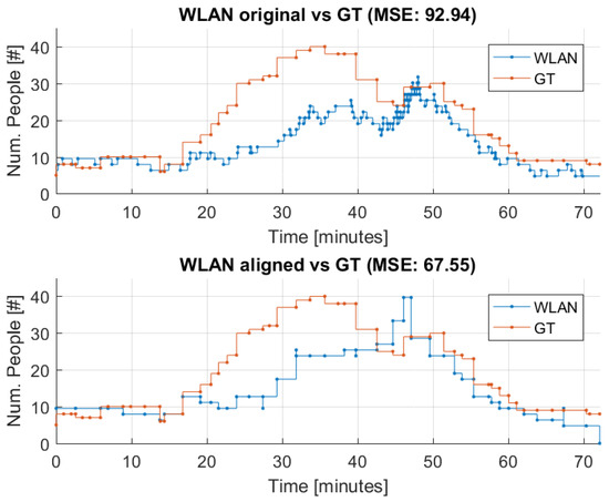 In Figure 3, the WLAN estimator is compared to ground truth (GT), both before and after the alignment. On this figure, the bus occupancy is indicated over time to illustrate how the enter and exit events are accumulated.