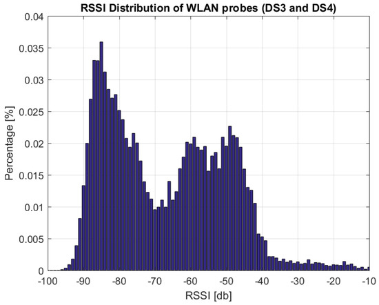 Distributionof registered RSSI values of collected WLAN probes in datasets 3 and 4 (DS3 and DS4) (bin size 1 dB).