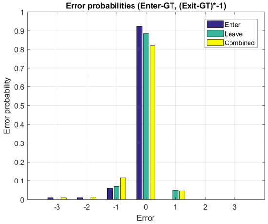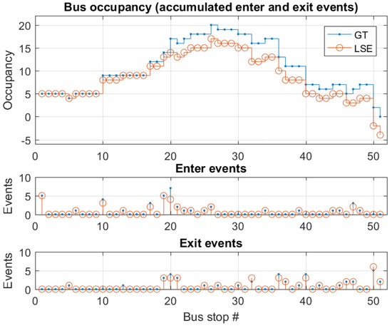 The empiric distribution of the differences of the LSE enter events and of the GT enter events, and of the differences of the GT exit events and the LSE exit events (note the inverse sign) for the bus trips DS1 and DS2 are shown in Figure 6. The convolution of these two distributions, or analog, the empiric distribution of the LSE occupancy change per bus stop minus the GT occupancy change per bus stop, is also shown in Figure 6. The latter shows a mean error per bus stop of −0.1237, i.e., the LSE shows some drift to smaller occupancy values as compared to the GT bus occupancy in these two bus trips. This is also seen in the right end of Figure 5, where the LSE becomes negative, while GT becomes 0.