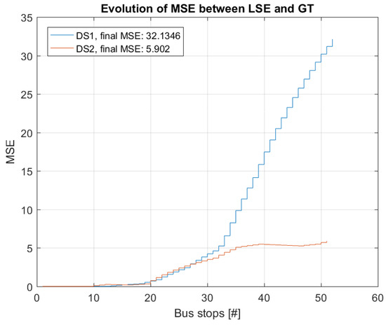 To illustrate the accumulating error of the LSE estimator, the MSE is calculated between GT and LSE occupancy for an increasing number of bus stops along the bus route. In Figure 7, the evolution of the MSE is presented for DS1 and DS2. From this, it is apparent that the error accumulates, i.e., the MSE shows a trend to increase over an increasing number of bus stops in the route for both data sets.
