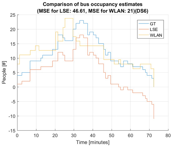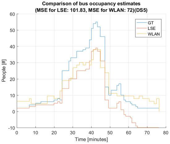 Figure 8 and Figure 9 present the estimated bus occupancy and GT based on DS5 and DS6, respectively. From these plots, it is seen that both estimators generally follow the GT. For DS5, the WLAN estimator generally follows the shape of GT, but results in both over- and underestimations. The LSE estimator mostly follows changes in GT; however, over time, small errors accumulate that it never recovers from. This means that the LSE estimates a negative value in the last part of the bus trip.