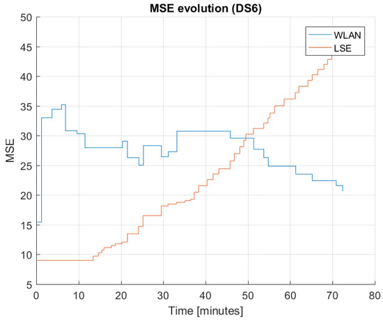 It is important to observe how the error evolves with time, as this gives good insight into estimator behavior. In Figure 10, the evolution of MSE is plotted for LSE and WLAN for DS6, and this figure presents a typical behavior of estimation errors over time, which is in correspondence with the estimator nature. The LSE MSE increases from start to end, with almost a linear increase throughout the bus trip. The WLAN MSE fluctuates in an interval between 25 and 35, being lower at the beginning and at the end of the trip.