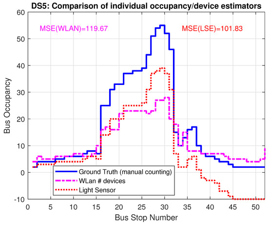 Bus occupancy (LSE) and number of detected devices (WLAN) for trace DS5 WITHOUT inclusion of and from the fusion approach.