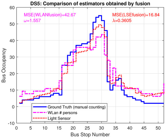 Figure 11 shows, as the starting point, the estimation when applying the WLAN estimator and the LSE individually for data set DS5. As shown earlier, the LSE underestimates the occupancy, which ultimately leads to even negative estimates to the right end of the figure. The MSE of both estimators is above 100.