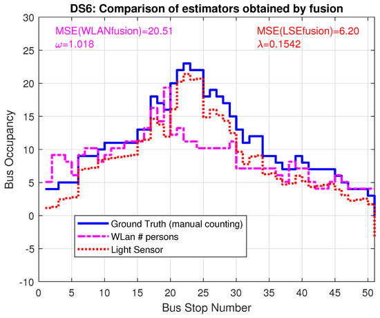 Bus occupancy (LSE) and number of detected devices (WLAN) for trace DS6 WITHOUT inclusion of and from the fusion approach.