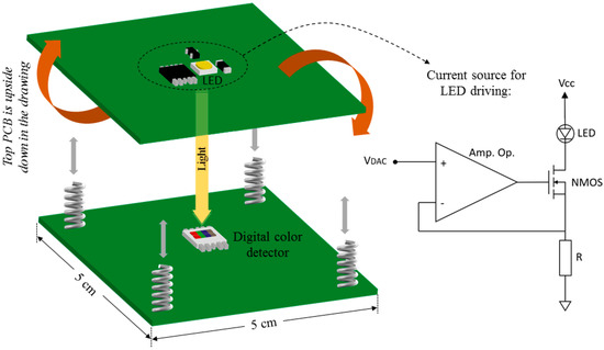 The LED model GW PSLMS1.EC−GSGU−5C7E−1 (OSRAM Opto Semiconductors, Regensburg, Germany) is biased in the range of 0−10 mA using a programmable current source, as shown in the detail of Figure 2. The objective of biasing the LED with a selectable current is to implement an automatic optimization in the output of the digital photodetector for subjects with very different weights and constitutions. This avoids oscillations of the signal close to the limits of the allowed range, which might produce the saturation of the detector. The current flowing through the LED is determined by controlling the current across the resistor. The operational amplifier model LT1366 (Linear Technology Corporation, Milpitas, CA, USA) forces a voltage drop of VDAC in the resistor, with this value being the voltage generated in the digital to analog converter (DAC) of the microcontroller board. Considering that the bias voltage of the LED is very close to 2.62 V, and assuming a negligible voltage drop VDS in the NMOS transistor model 2N7000 (Semiconductor Components Industries LLC, Phoenix, AZ USA), a maximum value of VDAC of 0.68 V is allowed; therefore, using a resistance of 68 Ω, the maximum selectable current is 10 mA.