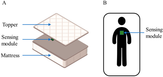 Location of the sensing module in the bed: perspective view (A) and top view (B).