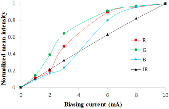 The mean values of the sequences were also evaluated. Figure 5 presents the normalized mean intensities of each color component for different bias currents.