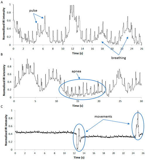 Figure 6 shows examples of BCG curves obtained with the presented system corresponding to a healthy patient lying in supine (A) and prone (B) positions. Simple visual inspection of these graphics allows the identification of the peaks corresponding to the heart beating and the oscillation of the baseline due to the breathing of the subject. The curve shown in Figure 6B includes a period of several seconds where apnea occurred when the subject was asked to hold his breath. As expected, the movement of the subjects while they are lying on the bed causes vibrations in the mattress much stronger than those produced by heart beating and breathing, as can be seen in Figure 6C.