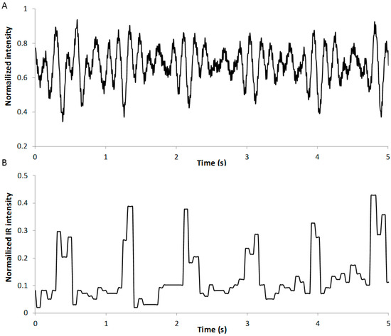 In Figure 7, a BCG signal obtained with the presented system is compared with the same curve obtained by means of a BCG system based on a strip consisting of an 800 mm long, 8 mm wide Piezo film (piezoelectric PVDF polymer, TE Connectivity, Ltd., Switzerland), also developed by our research group following the analog scheme proposed [26]. As is known, the strings compressed under the mass of the mattress and the patient act as mechanical isolators [27]. This produces an attenuation of the response of the system to vibration frequencies higher than the undamped natural frequency of the springs, which, in this case, is set close to 1 Hz, depending on the mass of the lying subject. As a result, the proposed system is mainly sensitive to the main frequencies of the mattress caused by the heartbeat and breathing of the subject, and the generated signal does not fit the classical BCG signal shape, as shown in Figure 7B [5]. This means that the developed prototype based on the digital optical detector is not able to provide information about the overall performance of the circulatory system. Nevertheless, from the curve of Figure 7B, the identification of the heart beating is simpler than in Figure 7A, not only by visual inspection but also by conducting a simpler signal processing than is usually included in BCG systems [21,28].