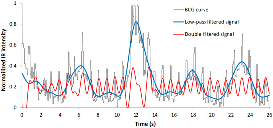 For the estimation of the mean HR, the sequence of the BCG curve is double-filtered: first, a digital seventh-order IIR high-pass filter with a stop-band frequency of 0.1 Hz and a pass-band frequency of 0.5 Hz is used to eliminate low-frequency components caused by breathing; after that, another seventh-order IIR low-pass filter with a stop-band frequency of 1 Hz and a pass-band frequency of 5 Hz is applied to the data with the aim of reducing the frequency spectrum to the first harmonics (see red line in Figure 8). The main element of the FFT of these processed data corresponds to the mean BR in this time interval.