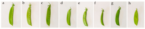 Pea pods of the different cultivars of mangetout analyzed. From left to right: Local landrace (a), AR-24007 (b), Capuchino (c), Tirabeque IS (d), Tirabí (e), Pea Zuccola (f), Pea Delikata (g) and Bamby (h).