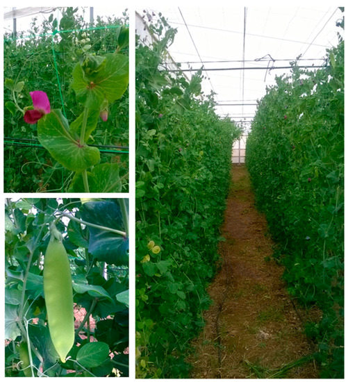 Edible pods of Pisum sativum L. spp. arvense (tirabeque or mangetout) were grown in an organic greenhouse of 800 m2, at Instituto de Investigacion y Formacion Agraria y Pesquera (IFAPA) Center “La Mojonera” (36°48′ N, 2°41′ W; altitude 142 m). The crop (Figure 2) was carried out according to European ecological regulations [32]. The crop cycle took place between October 2020 and March 2021. Two treatments, T100 (100% fertigation treatment) and T50 (50% of water and fertilizers applied), were arranged in a randomized complete block design with 3 replicates, for each cultivar and fertigation treatment, being the planting density of 4 plants per m2 [13]. T100 consisted of water and fertilizer provided according to fertigation management. The fertigation treatments allowed us to have a larger number of samples with physicochemical variability (different qualities) to develop NIRS predictive models.