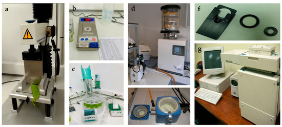 Detail of Texturometer XTPlus Texture Analyzer (a); Smart-1 digital refractometer (b); Automatic Metrohm 862 Titrosampler (c); Freeze-drying equipment (d); Mill (e); NIRS sample holder (f); Spectrometer Model 6500 Foss-NIRSystems (g).