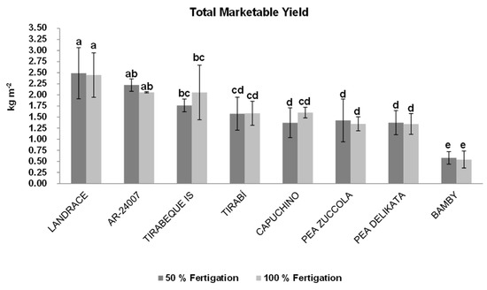 Total marketable yield (kg m−2) of the different varieties of mangetout under different fertigation treatments (T50 and T100). Bars with different lowercase letters were significantly different at p < 0.05 (Tukey’s multiple range test).